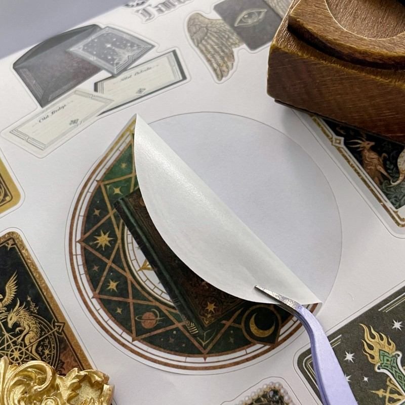 Description: Dan Sheng's <Emerald Spell> sticker book. 20 sheets. This sticker book features elements including statues, wands, books, potions, magical artifacts, flowers, crosses, demonic symbols and more. It's the perfect choice for journaling enthusiasts.
