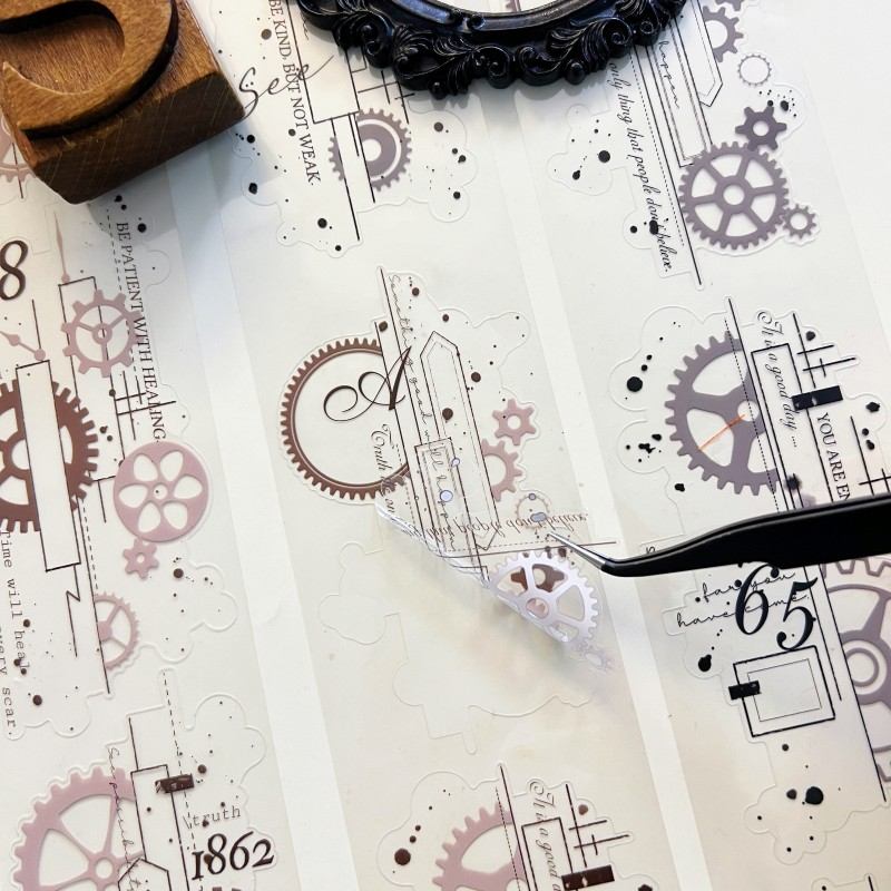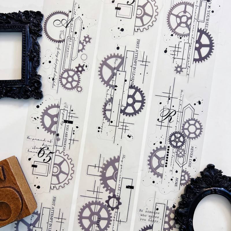 Description: Yier’s <gear trace> PET tape. Pre-cut. Journal supplies, scrapbook supplies, planner sticker, journal stickers.
