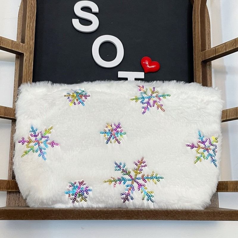 Description: iridescent snow pouch. This is a storage pouch with beautiful snow pattern, perfect for use as a storage bag, makeup pouch, or document holder. It’s a unique and stylish addition to your collection.