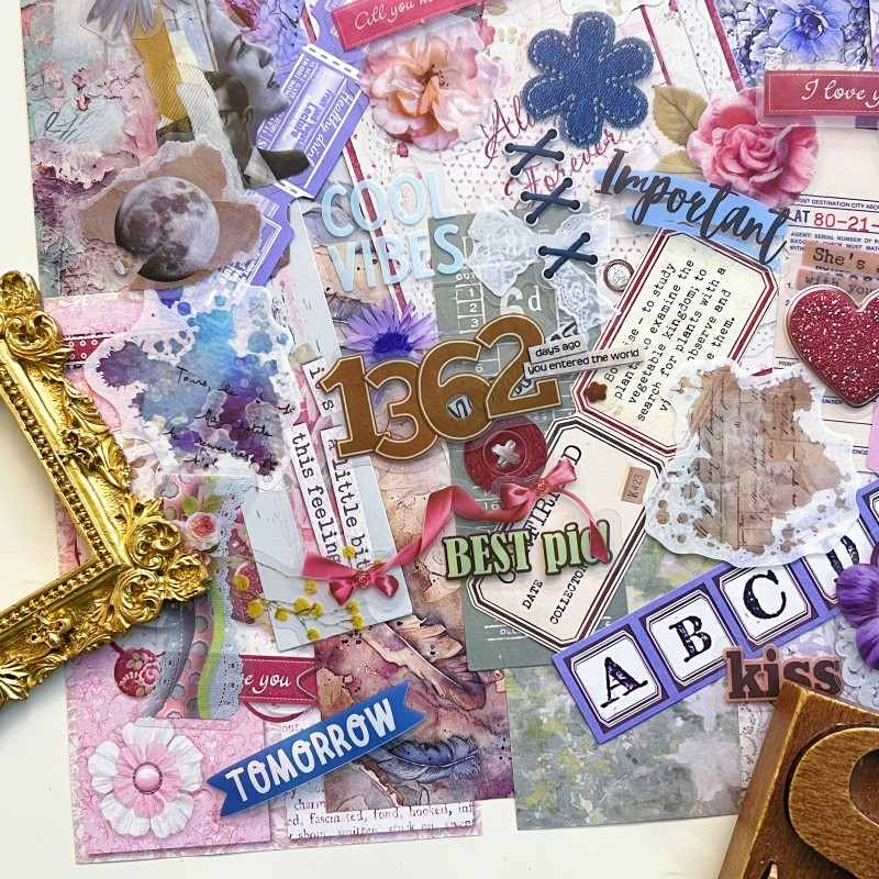 Description: lost garden ephemera mystery kit. This ephemera mystery kit features essential elements for journaling, including colorful collage papers, cflowers, butterflies, moons, English labels, English phrases, lace and more. DIY craft kit for journaling and scrapbook. Very friendly for journaling beginners.