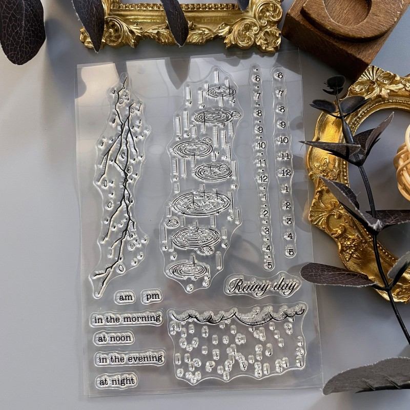 Description: <rain timeline> clear stamp is a perfect design for art journal, vintage journal, junk journal or any scrapbooks and crafts. Come in different shapes and sizes, allowing you to mix&match. Apply them to a stamping block to instantly add color to scrapbooks, letters, cards, and more!