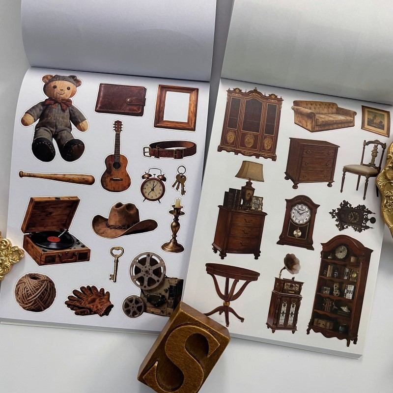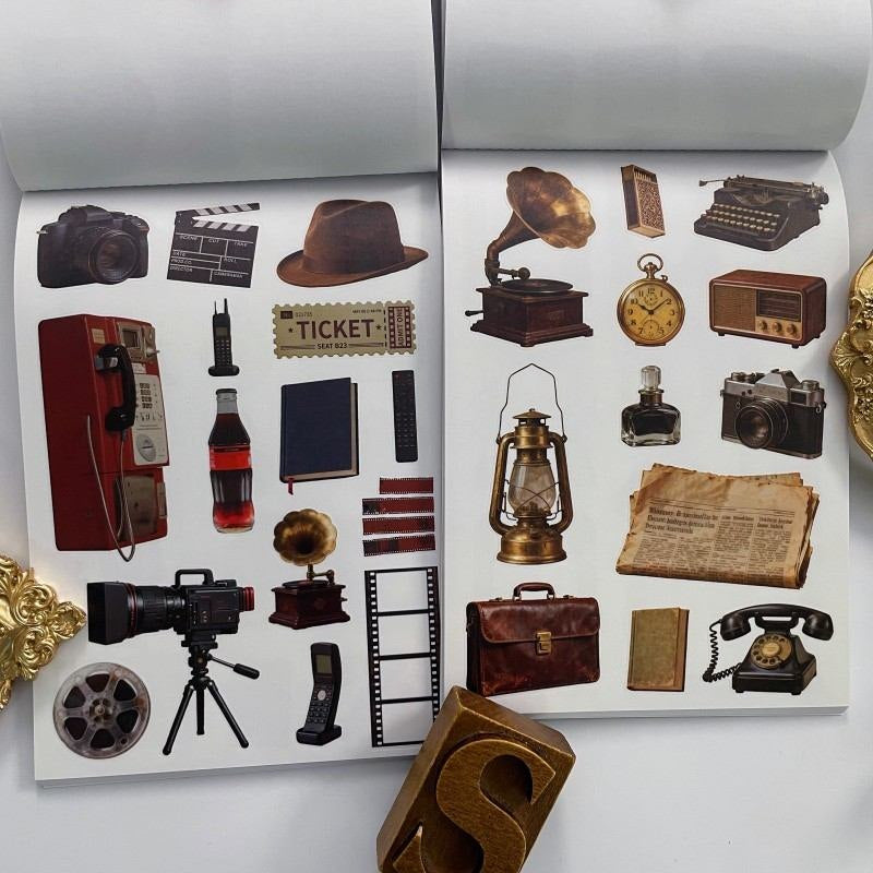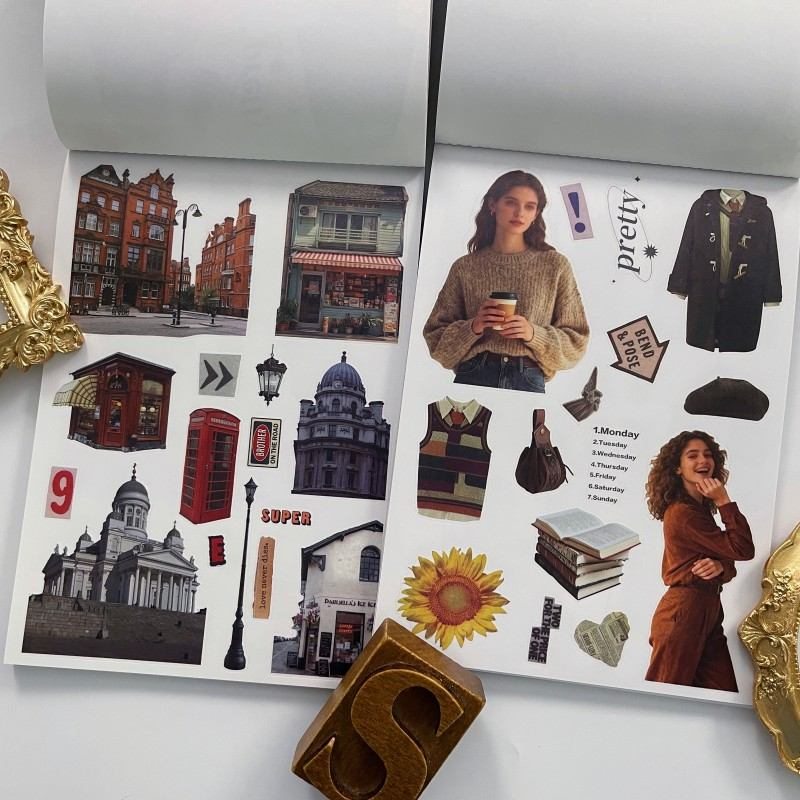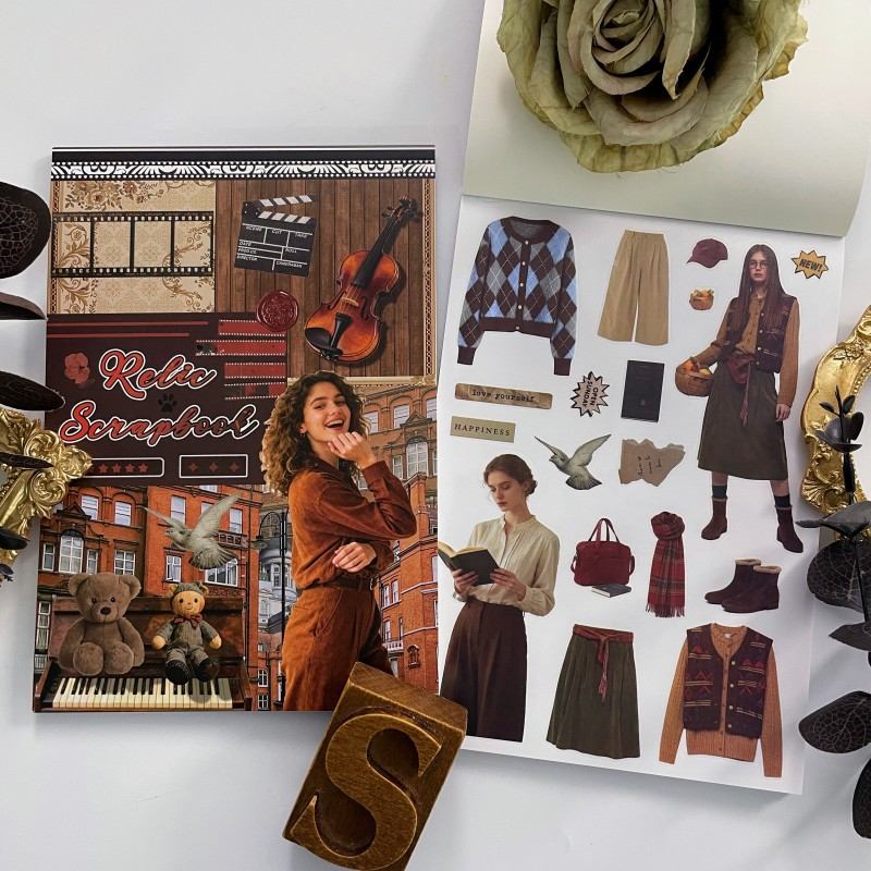 Description: Dan Sheng's <Retro Scrapbook> sticker book. 20 sheets. This sticker book features elements including girls, dresses, film, picture frames, stationery, musical instruments, desserts, coffee, architecture, vintage objects and more. It's the perfect choice for journaling enthusiasts.