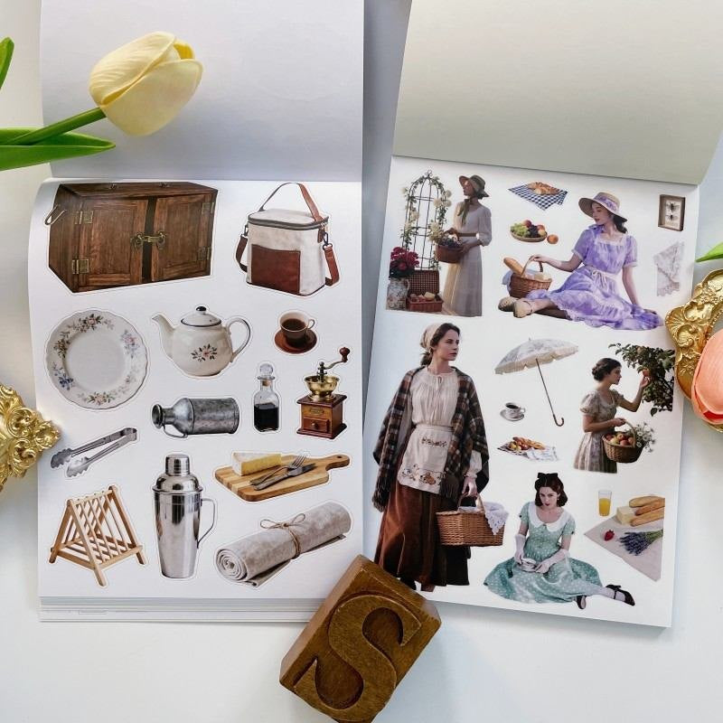 Description: Dan Sheng's <Tasty Picnic Moments> sticker book. 20 sheets. This sticker book features elements including girls, flowers, plants, fruits, hats, desserts, landscapes, bread and more. It's the perfect choice for journaling enthusiasts.